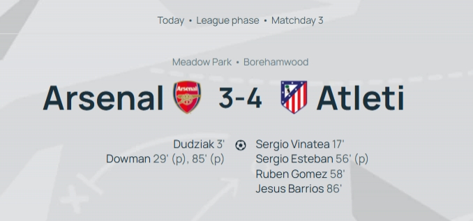后生欧冠:15岁说念曼点射双响,阿森纳3-4遭马竞逆转绝杀