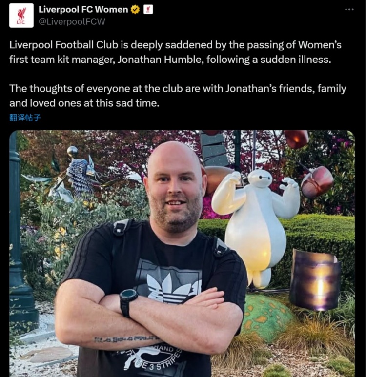 RIP!利物浦官方:女足职员乔纳森·汉布尔突发疾病灾荒离世