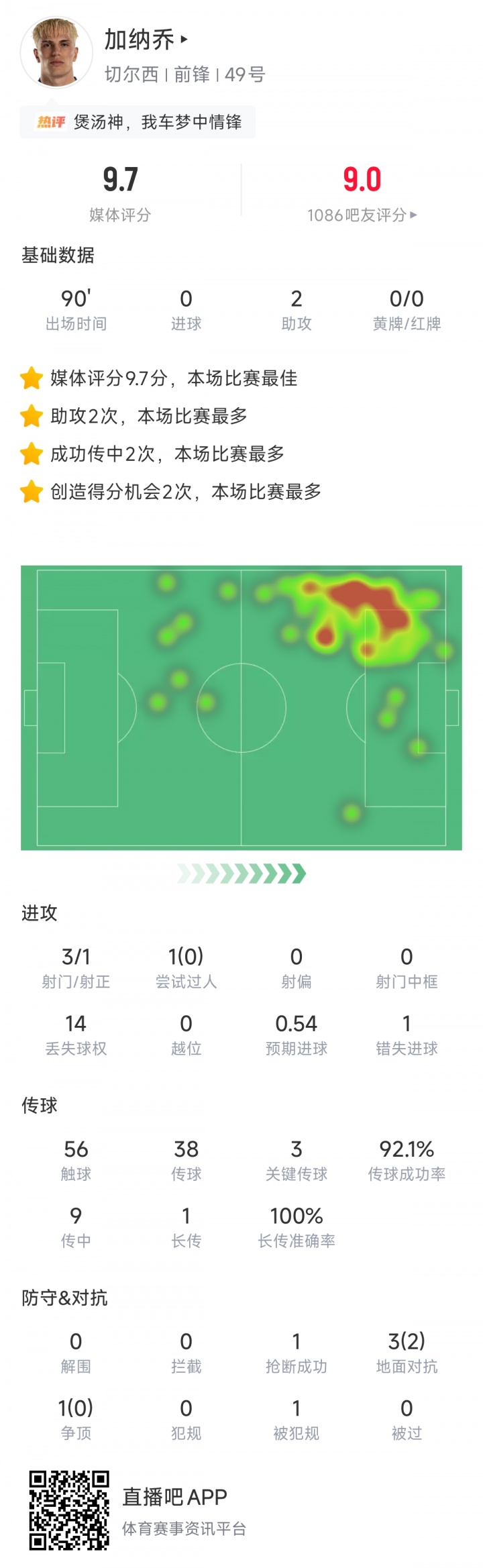 21岁的加纳乔刚加盟切尔西时相宜得一般,发达并不算差但怎么前6场比赛数据0球0助。好在加纳乔近期渐入佳境,坐稳首发的他近4场比赛2球2助,本场比赛更是拿到9.7的超高评分,全场第1。他此役56次触球14次丢球权,传球38次凯旋率92.1%,3次重要传球2次助攻,9次传中。