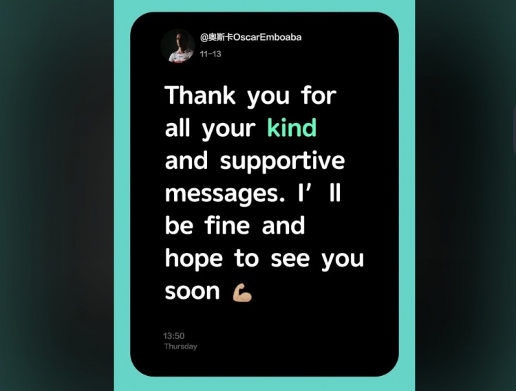 奥斯卡再报祯祥:感谢球迷们发来的祝愿与留言,请宽解我没事的