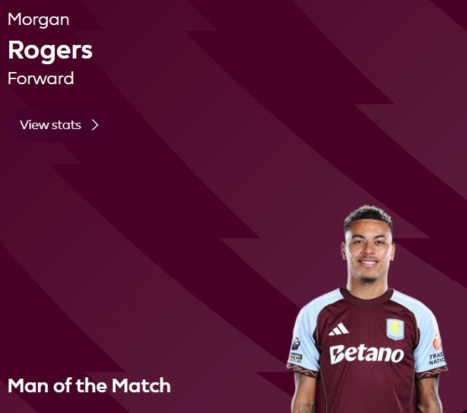 双响+放肆球制胜,摩根·罗杰斯当选维拉2-1利兹联全场最好球员