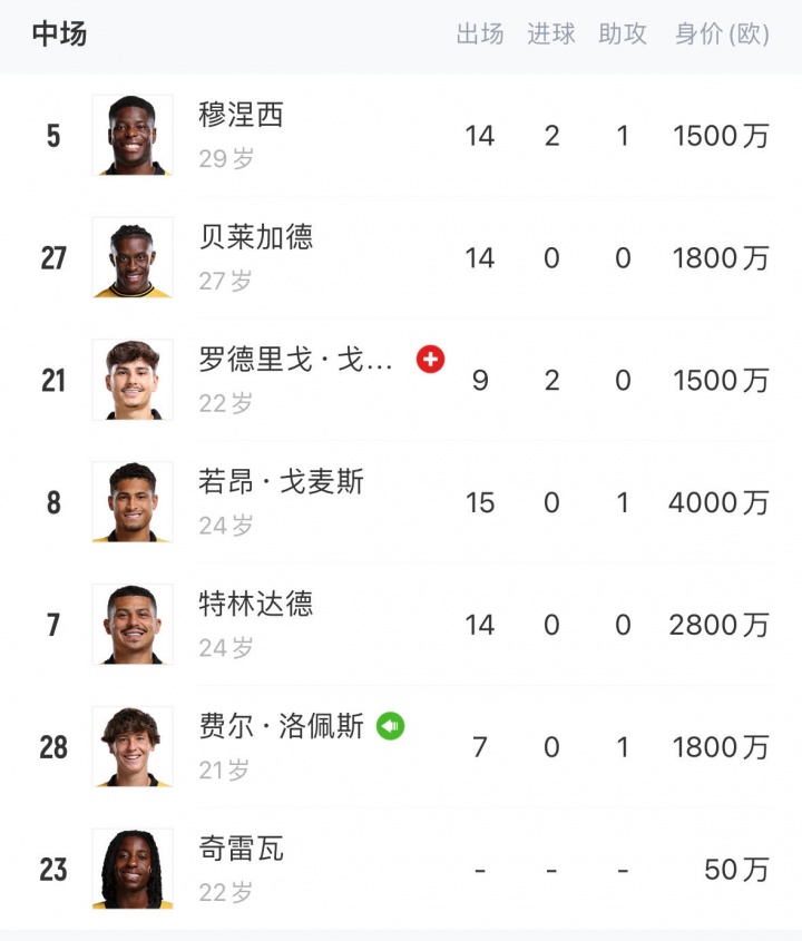 服从梯队or外租?狼队中场6东说念主身价超千万,1东说念主身价50万但0出场