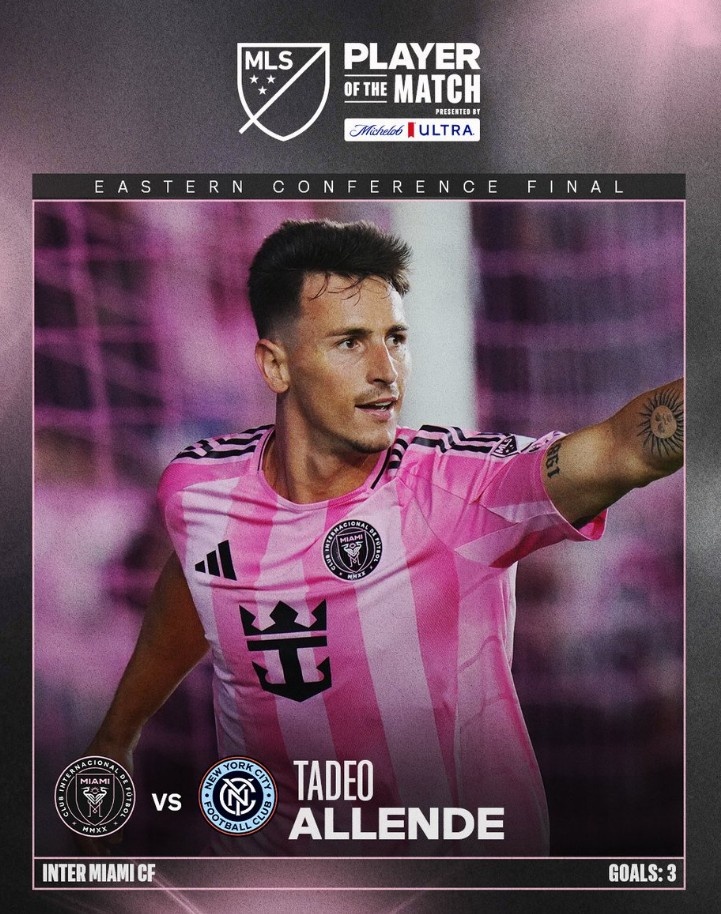 演出帽子戏法,好意思职联官方:阿连德当选迈阿密5-1纽约城全场最好