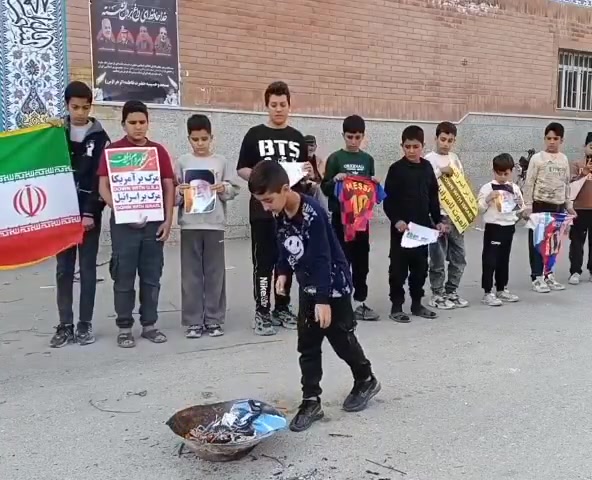 不满梅西与特朗普会面,有伊朗儿童焚烧梅西队服+举标语抗议