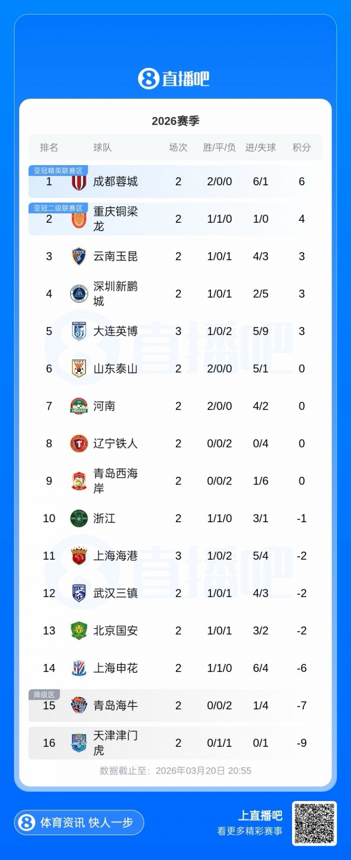 03月20日讯 今日中超第三轮先赛一场,海港0-1不敌英博,最新联赛排名榜如图,海港前三轮两负,目前积分为负2分。大连英博取得首胜,排在联赛排名榜第5位。