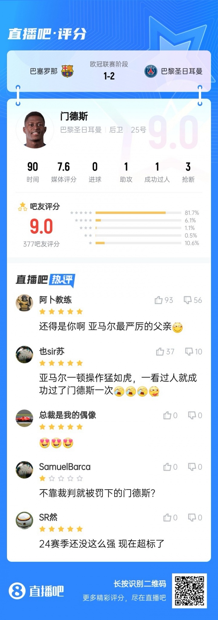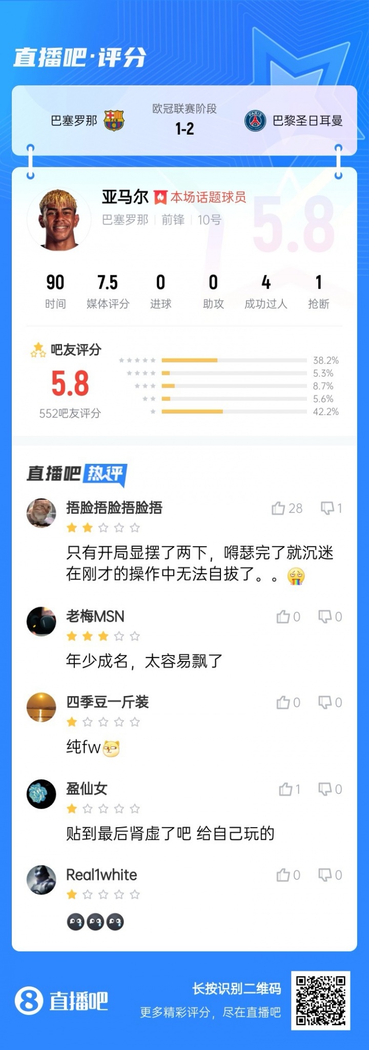 吧友们觉得门德斯本场是否已毕了亚马尔的发挥?