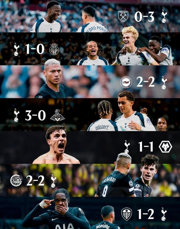 赛后热刺官方晒出了球队近期的战绩:3-0西汉姆、1-0比利亚雷亚尔、2-2布莱顿、3-0唐卡斯特流浪、1-1狼队、2-2博德忽闪、2-1利兹联。