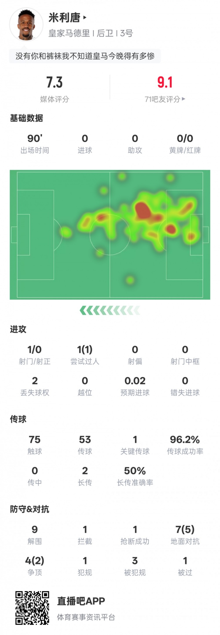 米利唐本场数据:1环节传球9突围+传球到手率96.2%,评分7.3
