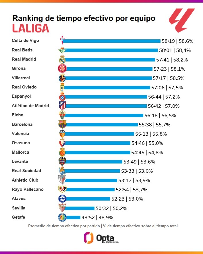 本赛季西甲场均净比赛技术榜:皇马57分41秒第三,巴萨55分38秒