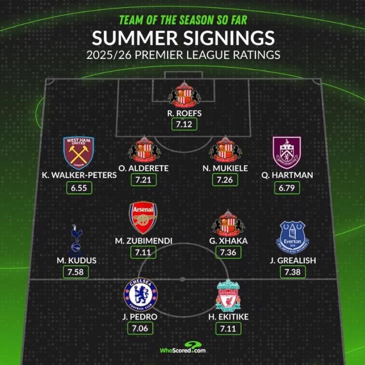 10月14日讯 英超7轮战罢,WhoScored评出了由今夏新援构成的最好11东谈主威望,四名桑德兰球员入选(数据为联赛数据)。