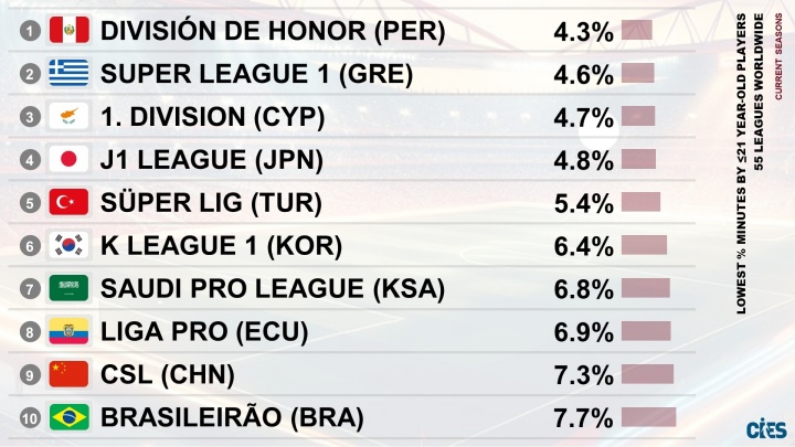 10月18日讯 近日,足球巨擘统计机构CIES发布最新统计,大家55个联赛中U21球员出场本领占比最少的联赛,秘鲁联赛4.3%居首,J联赛4.8%第4,K联赛6.4%第6,中超7.3%第9。