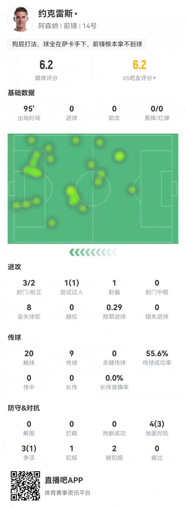 评分仅6.2!约克雷斯数据:3射2正,8次丢失球权,20次触球