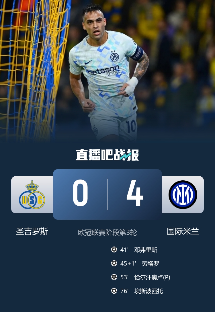 劳塔罗破门,埃斯波西托首球,国米4-0圣吉罗斯欧冠三连胜+各赛事七连胜。