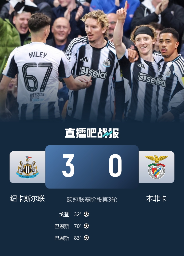 两连胜!纽卡3-0本菲卡 戈登立功巴恩斯双响 本菲卡欧冠3连败