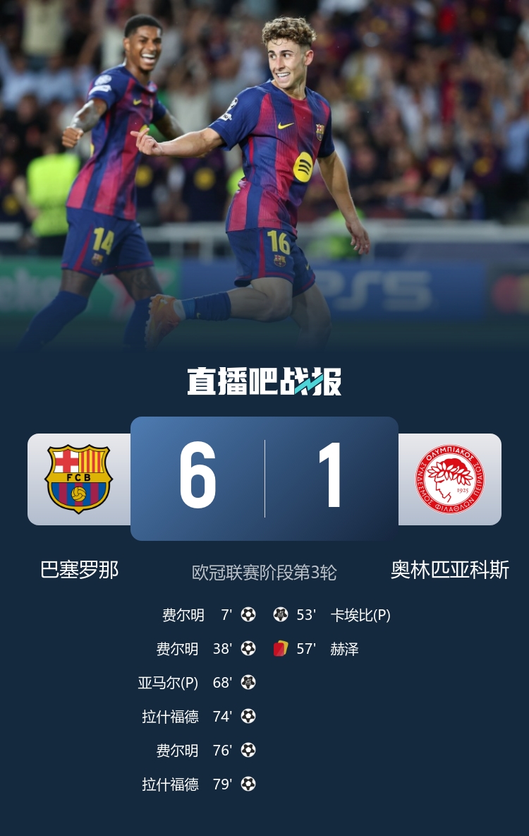费尔明戴帽,拉什福德双响,巴萨6-1大捷十东说念主奥林匹亚科斯。