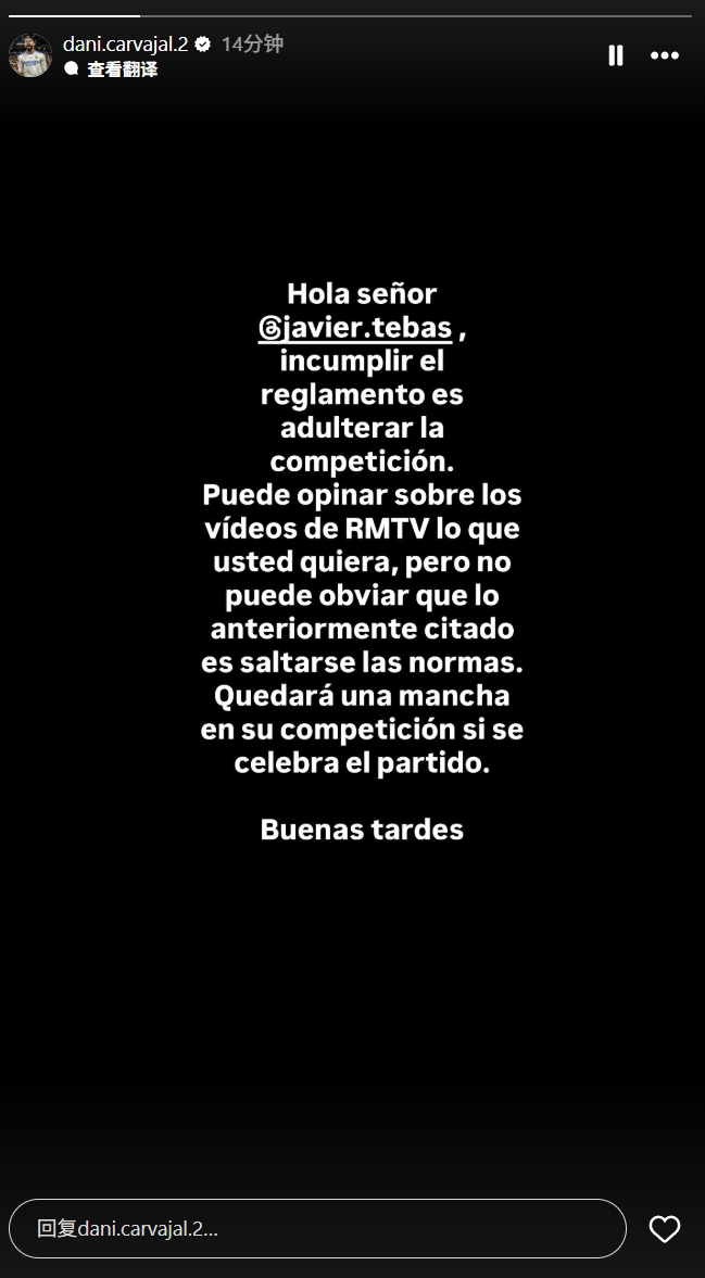 卡瓦哈尔回话特巴斯:随你若何说皇马TV,但国外赛等于违背限定