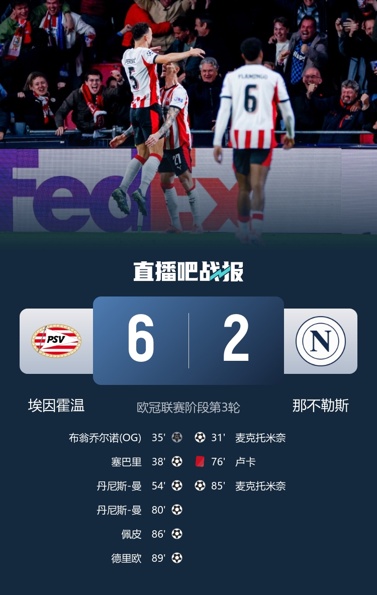 麦克托米奈双响,十东说念主那不勒斯客场2-6惨败埃因霍温,孔蒂带队双线作战各赛事两连败+近5场3负。