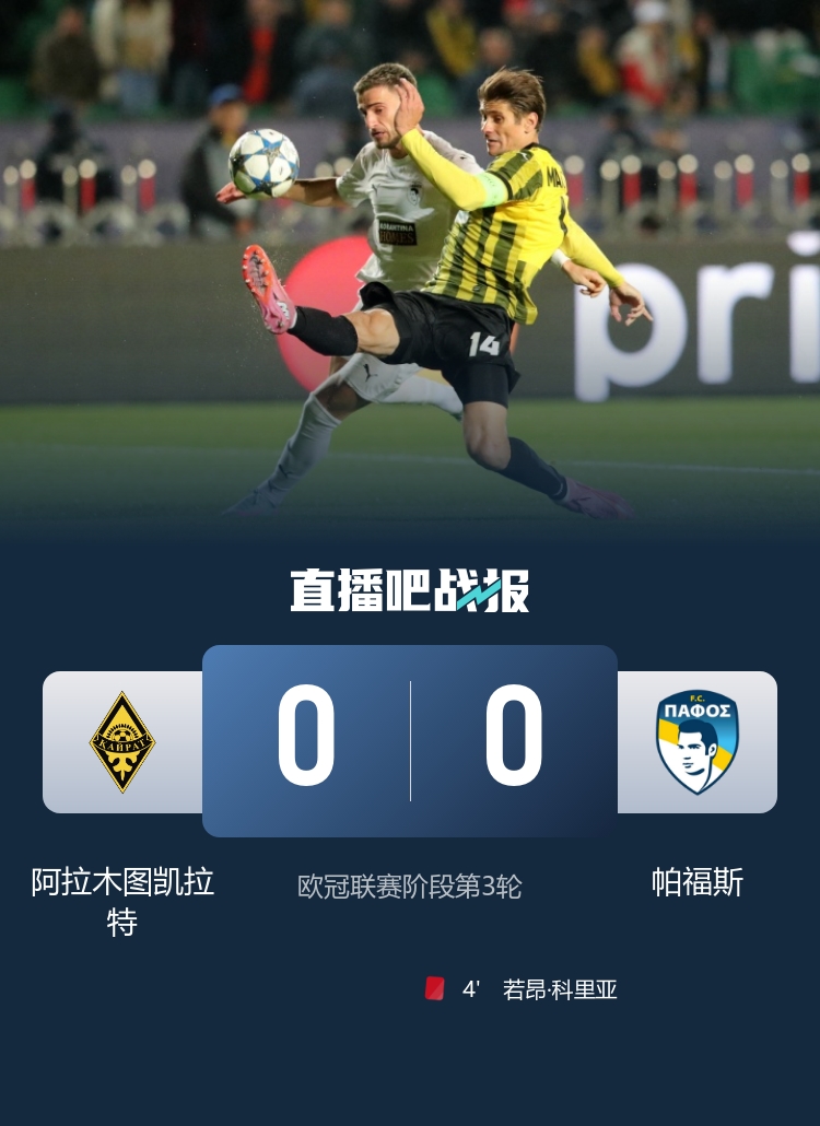 德拉戈米尔进球被吹,阿拉德掷中立柱,最终阿拉木图凯拉特0-0帕福斯。