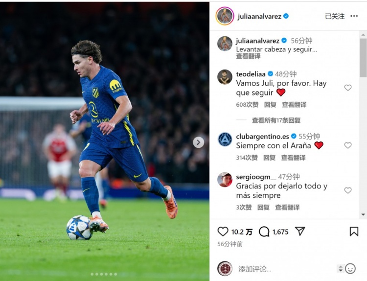 马竞时尚阿尔瓦雷斯此役踢满全场,赛后他在酬酢媒体上晒出比赛像片,配文:“抬入手,不竭前进。”