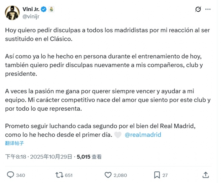 10月29日讯 维尼修斯在国度德比中,因不悦被换下,直接走回更衣室。当天,维尼修斯社媒就不悦被换下向皇马球迷、队友、俱乐部和主席致歉。