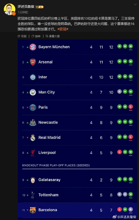 詹俊写说念:“欧冠排位赛四轮后的积分榜上游,英超排行13位的纽卡算是黑马了。三支保抓全胜的球队,唯独没丢球的是阿森纳。巴萨的驻守照旧大问题,这个赛季思进16强只怕要通过附加赛才行。”