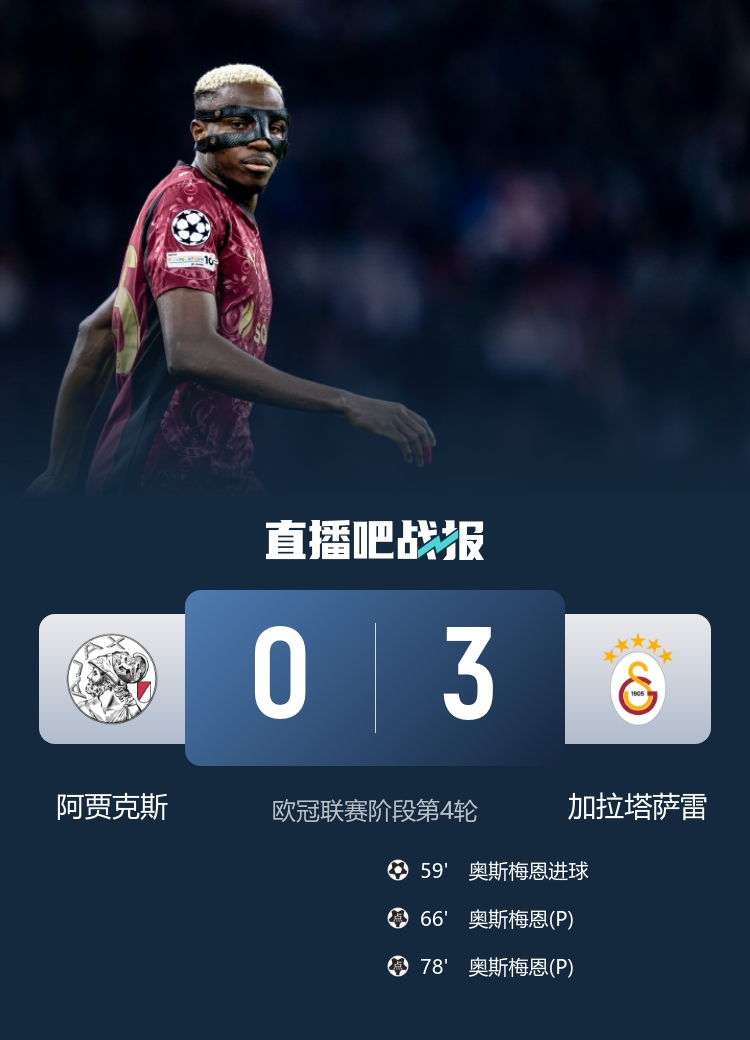 11月6日讯 欧冠联赛阶段第四轮比赛,阿贾克斯主场0-3不敌加拉塔萨雷。