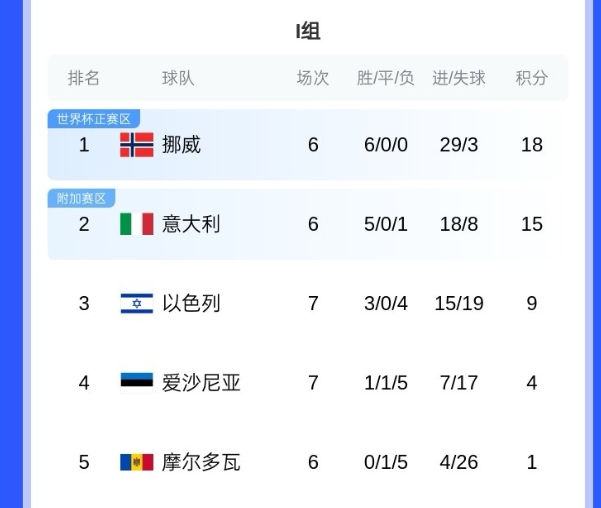 淌若挪威打败爱沙尼亚且意大利未能治服摩尔多瓦,那么挪威将自1998年后再次参加寰宇杯;淌若意大利输球,那么挪威只需要平局就足以晋级;淌若小组晋级需要在终末一轮比赛中决定,北京时辰11月16日挪威将与意大利径直对话。