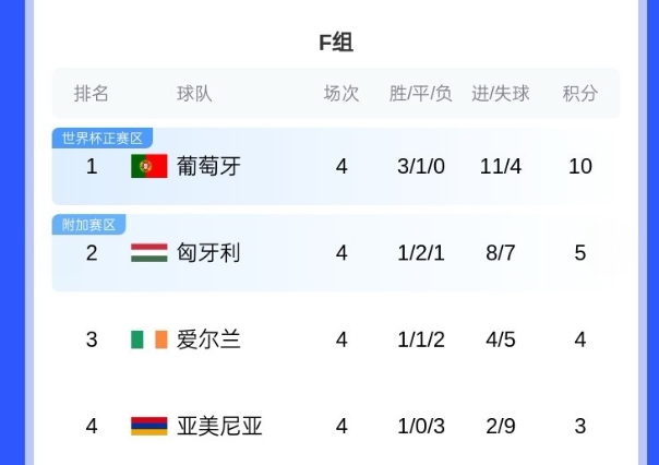 F组地方:C罗率领的葡萄牙惟有治服爱尔兰便能锁定小组头名,晋级寰宇杯;淌若先运转的比赛中,匈牙利未能打败亚好意思尼亚,那么葡萄牙平局就可锁定头名。