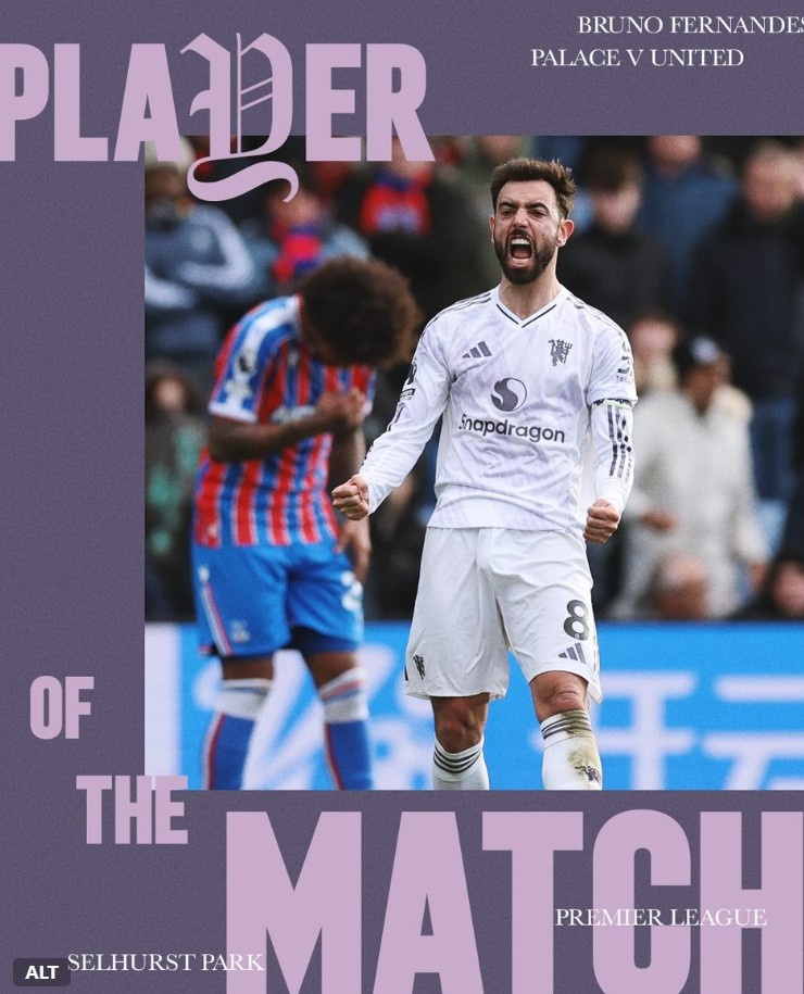本场比赛B费两次助攻队友破门,匡助球队完成逆转,他也当选曼联官方评比出的本场队内最好球员。