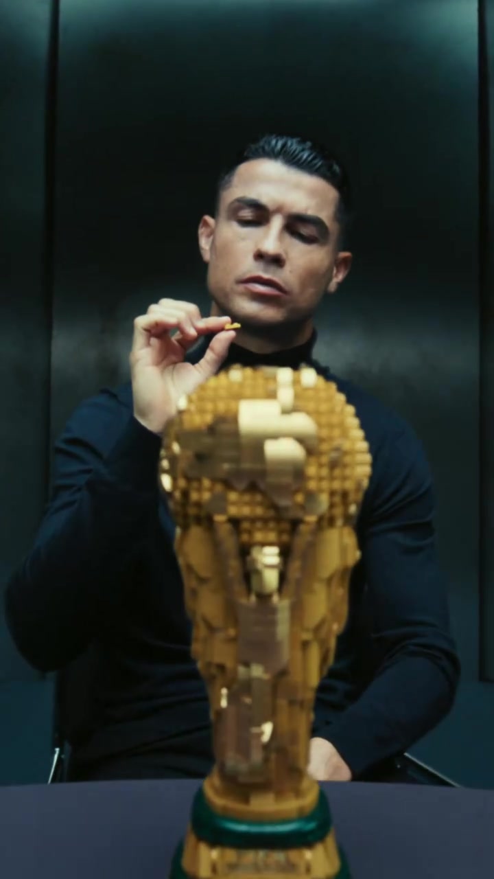在广告中,C罗、维尼修斯、姆巴佩、梅西一起在用乐高积木拼成世界杯赛 第一名 奖杯大力神杯,在最后阶段,四人都想将自己的公仔放在大力神杯顶上,但都被其他的人转动桌子阻拦。