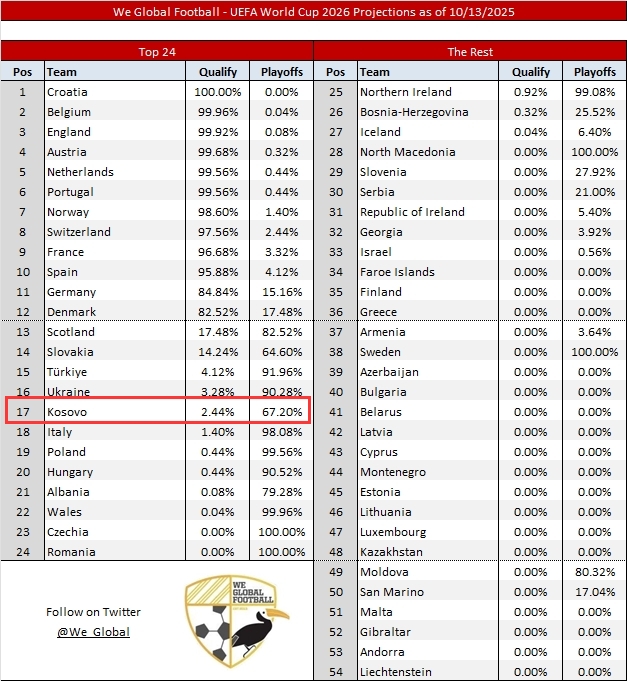 据We Global Football掂量,科索沃小组第一纵贯寰球杯的概率仅2.44%,但插足欧洲区附加赛的概率高达67.2%。