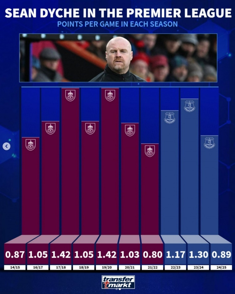 10月21日讯 戴奇顾惜合手教诺丁汉丛林,德转也盘货了戴奇此前合手教伯恩利以及埃弗顿在英超的赛季场均积分情况,具体如下: