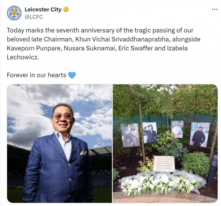 10月27日讯 莱斯特城官方社媒发文,记挂因直升机事故离世的前俱乐部主席维猜。