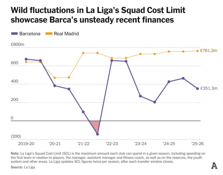 西甲球队成本上限的剧烈波动突显了巴萨近期财务景色不强大