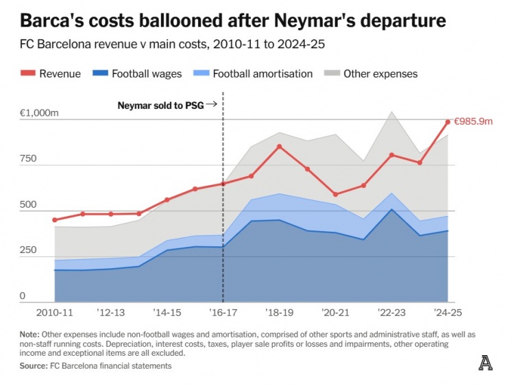 辘集两次股权出售及15%转播权措置,这些杠杆仅在22/23赛季就创造了8.015亿欧元司帐利润。西甲据此同步上调了巴萨的SCL额度。这十分必要:当赛季巴萨工资账单飙升至6.257亿欧元,创俱乐部记载并位列欧洲足球史第三,增长主要来自此前蔓延支付的薪资。