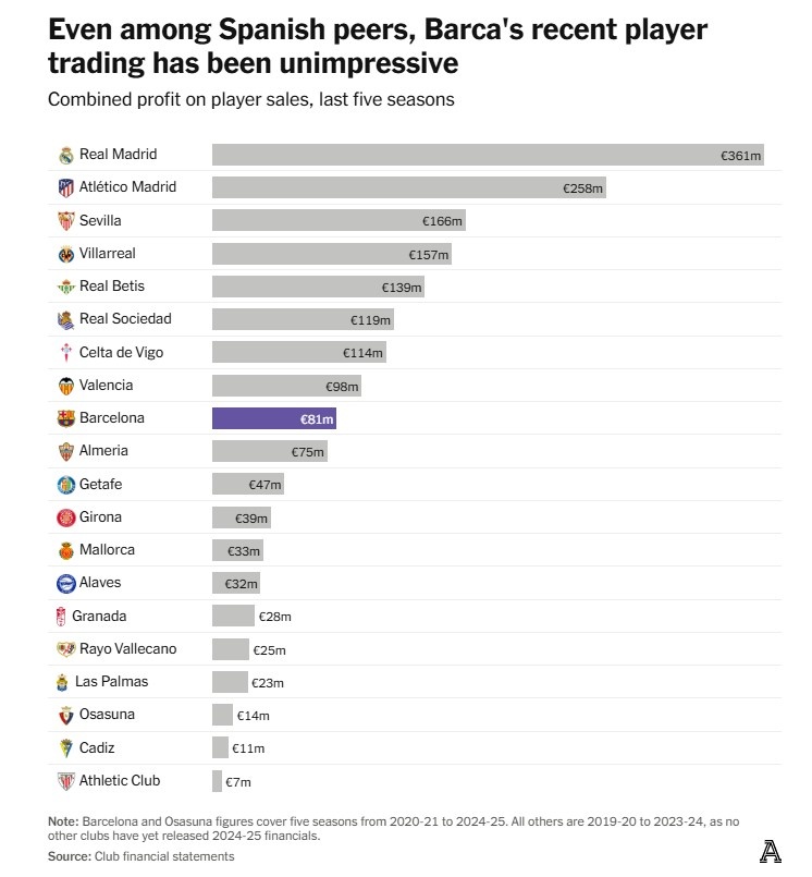 尔后卖东谈主收益缩水,即便23/24赛季通过出售登贝莱、凯西和尼科-冈萨雷斯赢利8060万欧元。畴昔五赛季球员销售总利润仅8140万欧元,若非21/22赛季对球员价值计提1.6亿欧元减值,数字将更出丑。此利润水平在西甲中游,远逾期于两家马德里俱乐部及欧洲多家敌手。