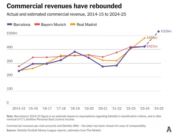 增长仍在延续。巴萨将PSL收入计入贸易项,但即便视其为一次性收益剔除,按德勤口径估算,其贸易营收可能仍冲破5亿欧元。