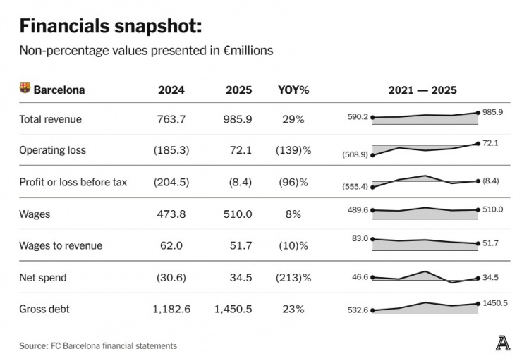 这笔贷款每年从俱乐部抽走约3000万欧元还款,且2031/32赛季需一次性支付2.657亿欧元。利率未知但展望较低;巴萨公告称标的利率为3%。