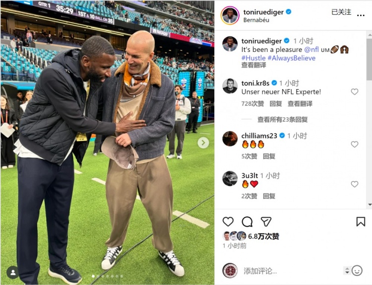 吕迪格晒现场不雅战NFL西班牙赛像片,王人达内出镜