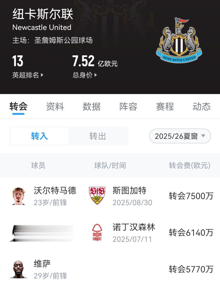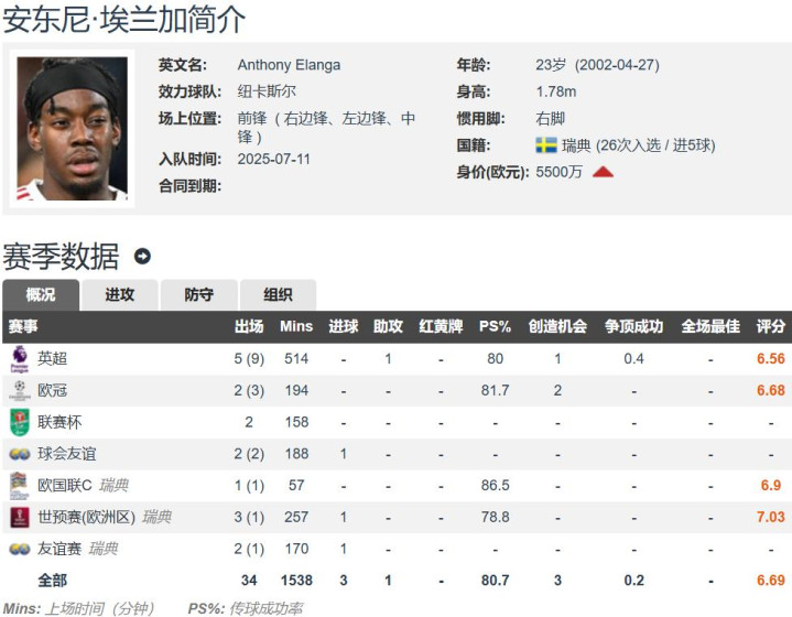 瑞典前卫伊兰加加盟纽卡斯尔以来,各项赛事出场21次,其中9次首发,统统出场865分钟,莫得赢得进球,仅送出2次助攻,当今德转估价5500万欧元。而民主刚果前卫维萨就更离谱了,加盟纽卡斯尔于今0出场,因为伤病的原因一直高挂免战牌。