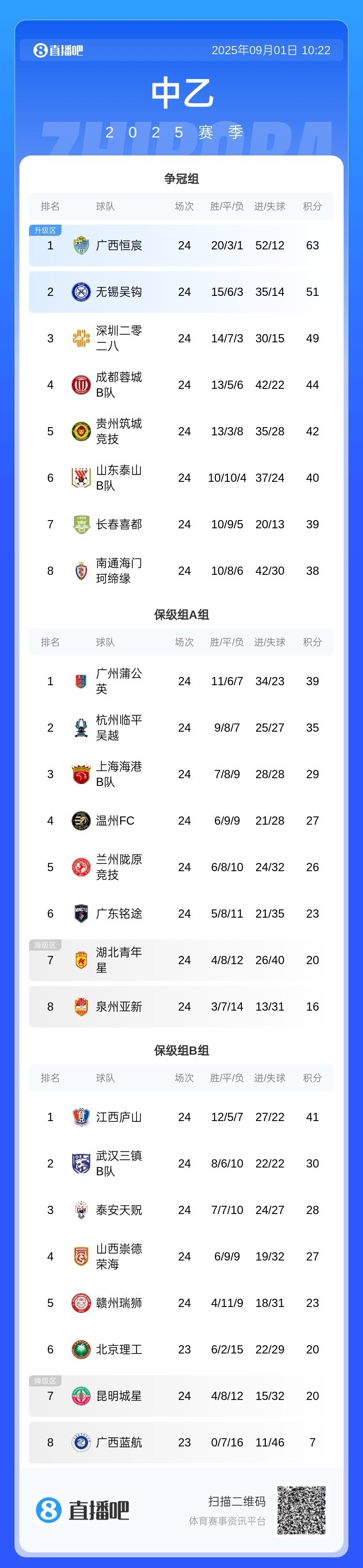 9月1日讯 中乙保级组规则第24轮争夺,海港B队2-2战平广州蒲公英,武汉三镇B队0-1不敌北京理工,广西蓝航1-1泰安天贶仍难求一胜。