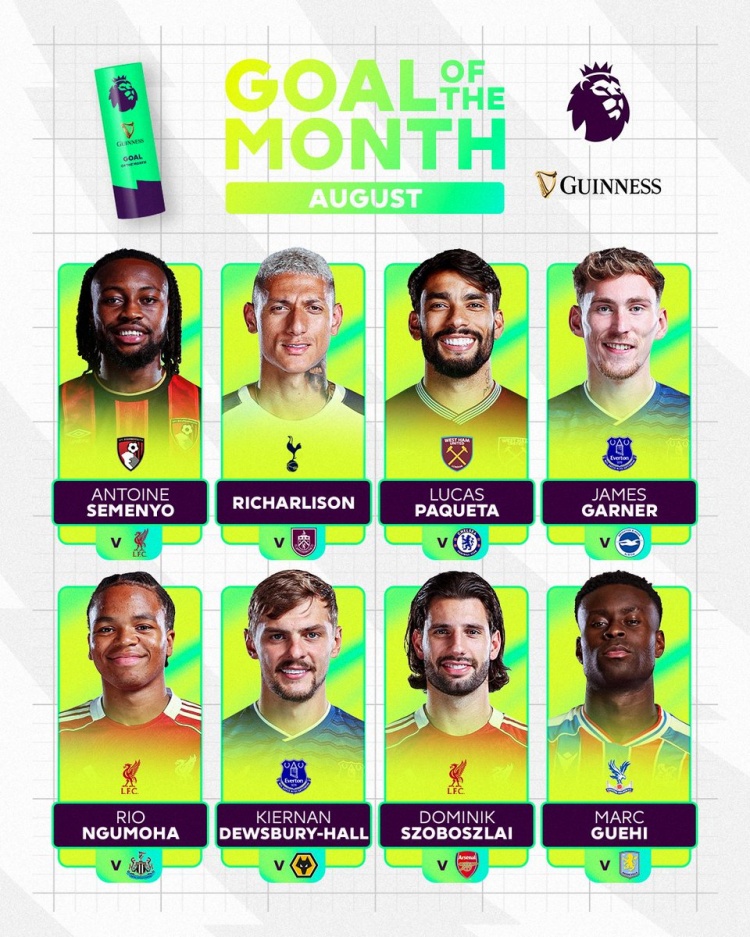 9月4日讯 英超官方公布了8月最好进球候选,理查利森倒钩、索博斯洛伊大肆球在列。