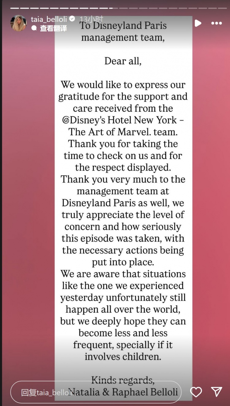 “致巴黎迪士尼乐土惩办团队,亲爱的诸位,咱们对纽约迪士尼货仓-漫威艺术的复旧和关怀暗意感谢。感谢你们抽出技能热枕咱们,并展现出尊重。咱们也相配感谢巴黎迪士尼乐土的惩办团队,咱们诚恳地感恩你们对此事件的宠爱以及所摄取的必要动作。
